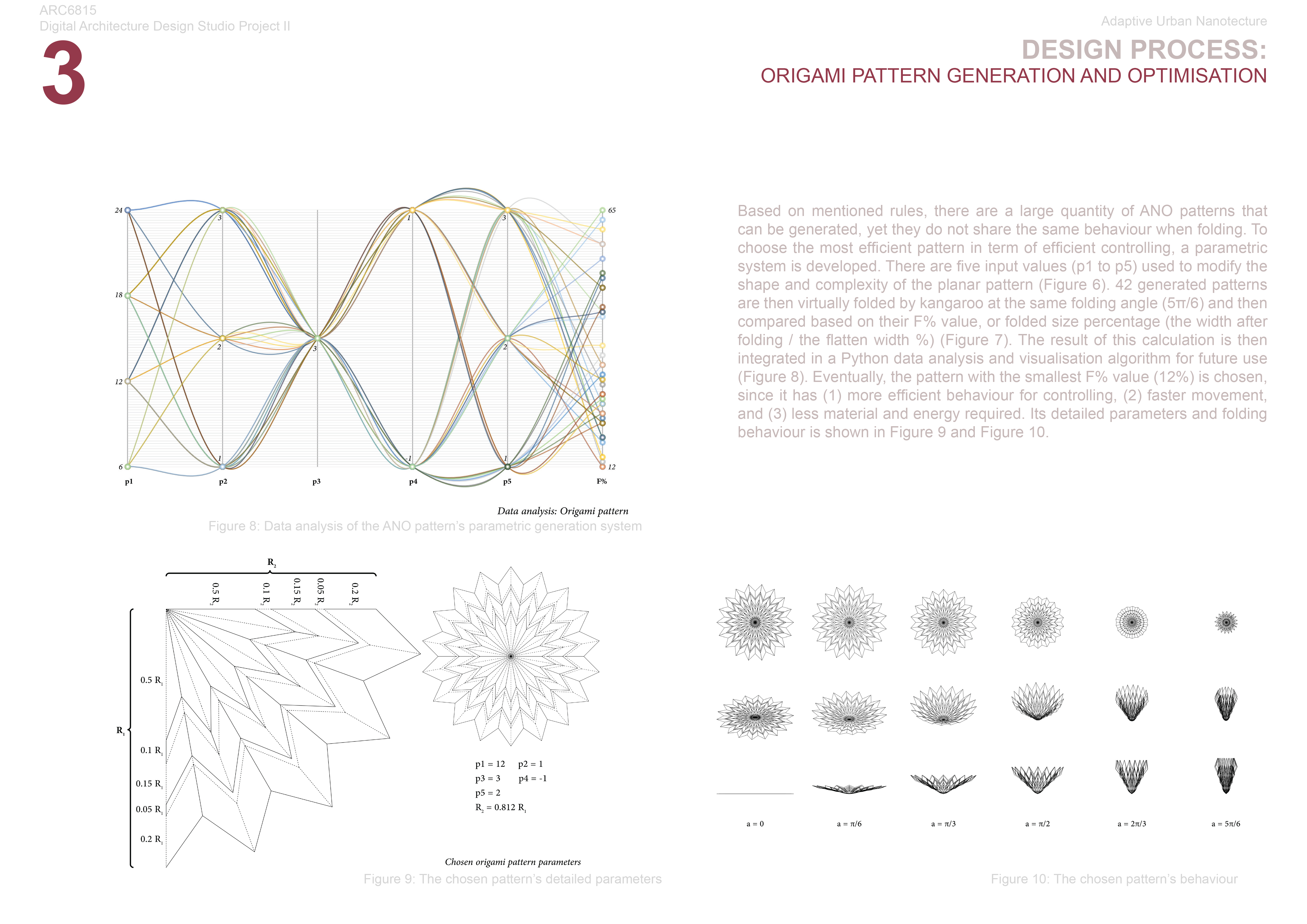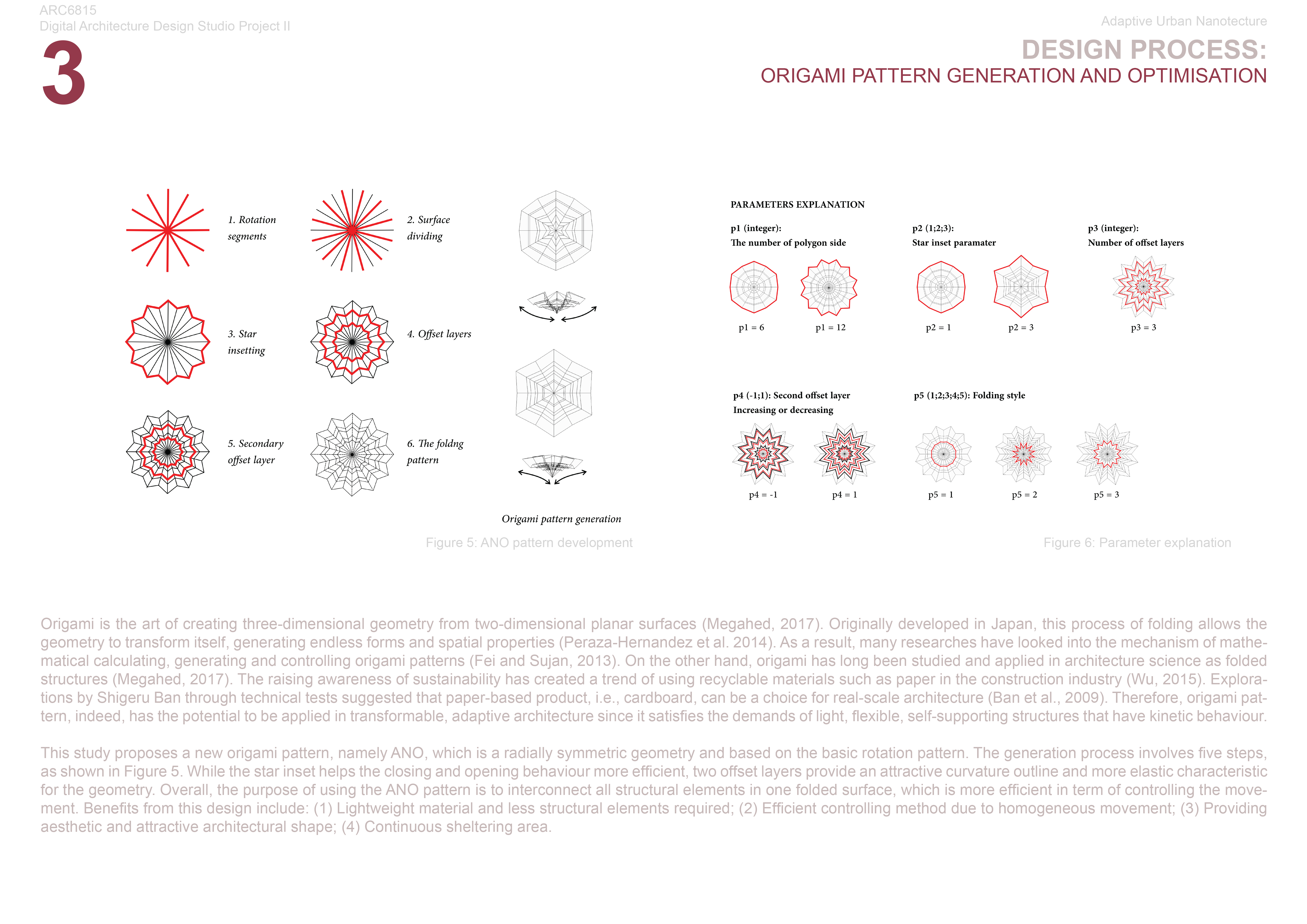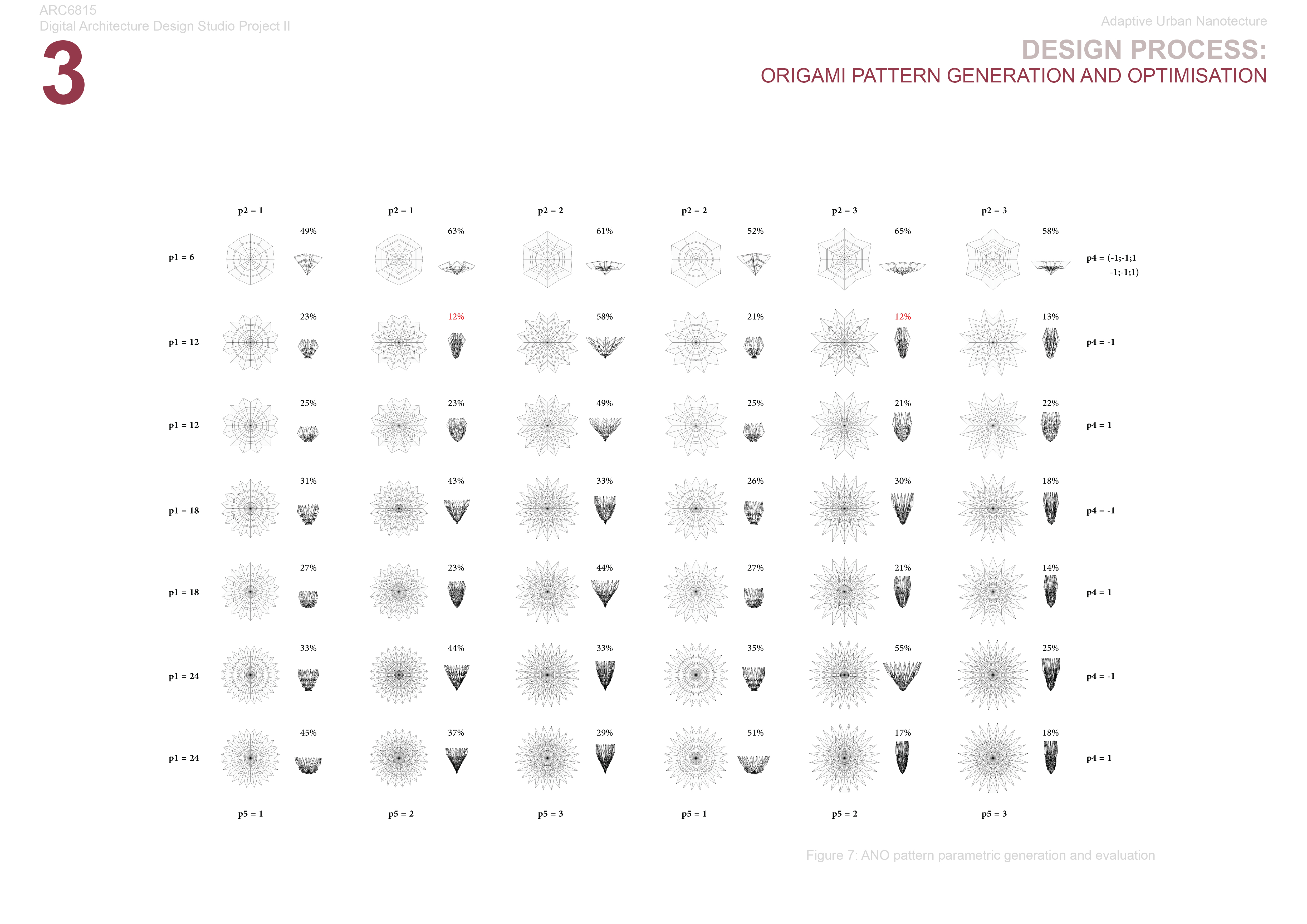To reduce the generating time and resources, a hypothesis is proposed, in which architectural optimisation process need to be limited by sets of rules based on phasic goals, in order to gain efficiency. Following this rule, the design process is proceeded in three phases: (1) Optimisation of geometry based on efficient movement; (2) Maximisation the effectiveness of the controlling mechanism and (3) Balancing of adaptability and flexibility based on site-analysis.