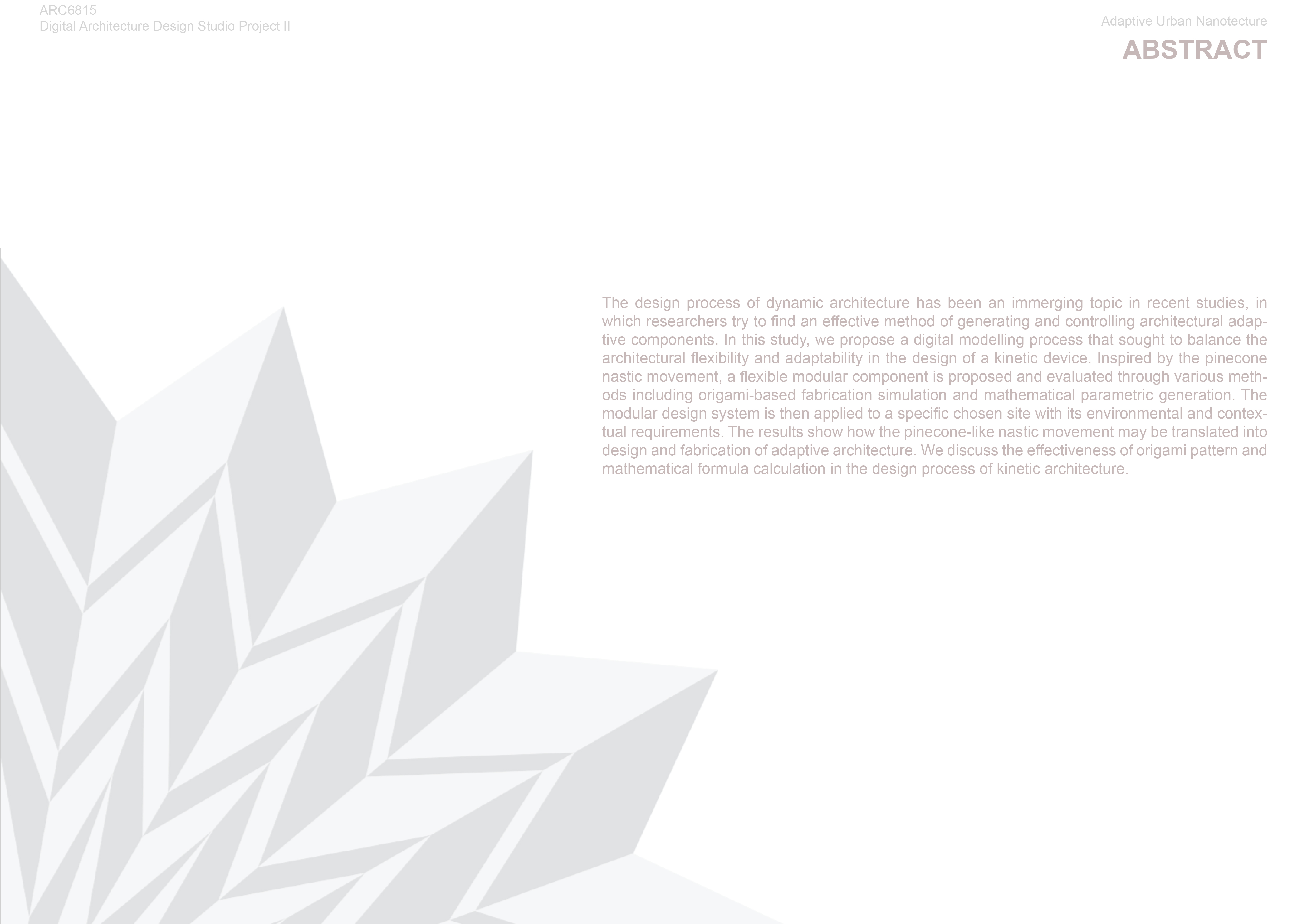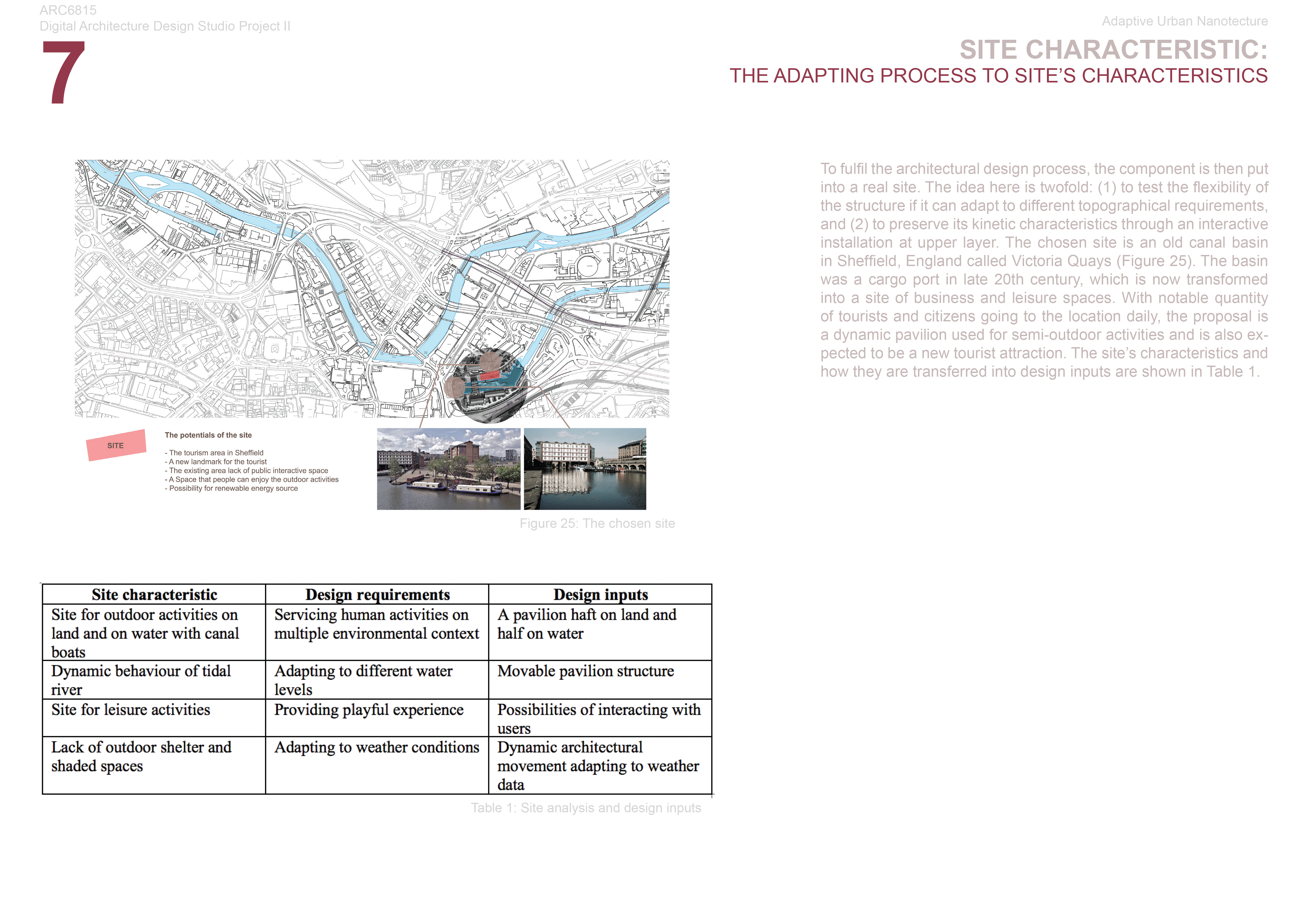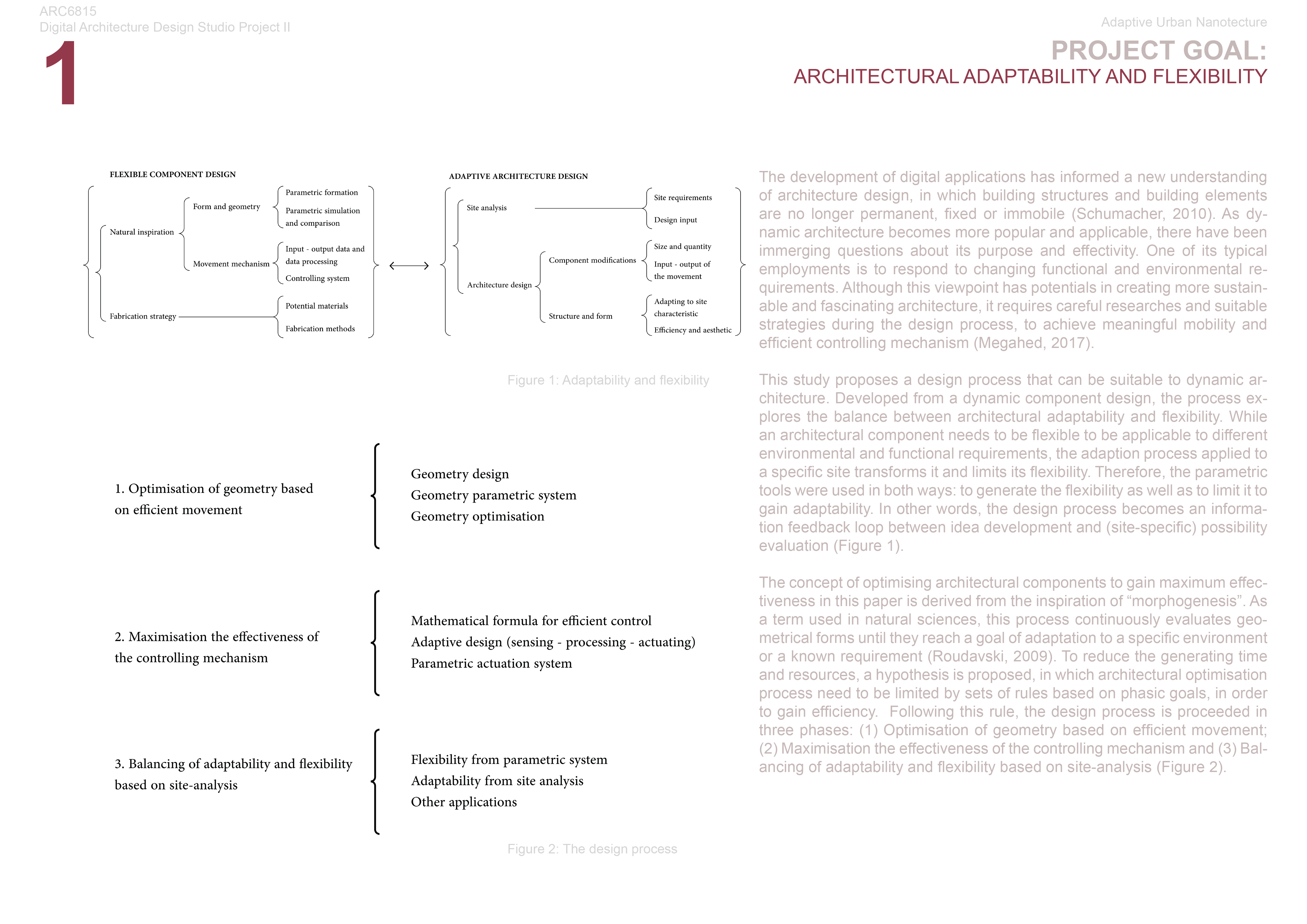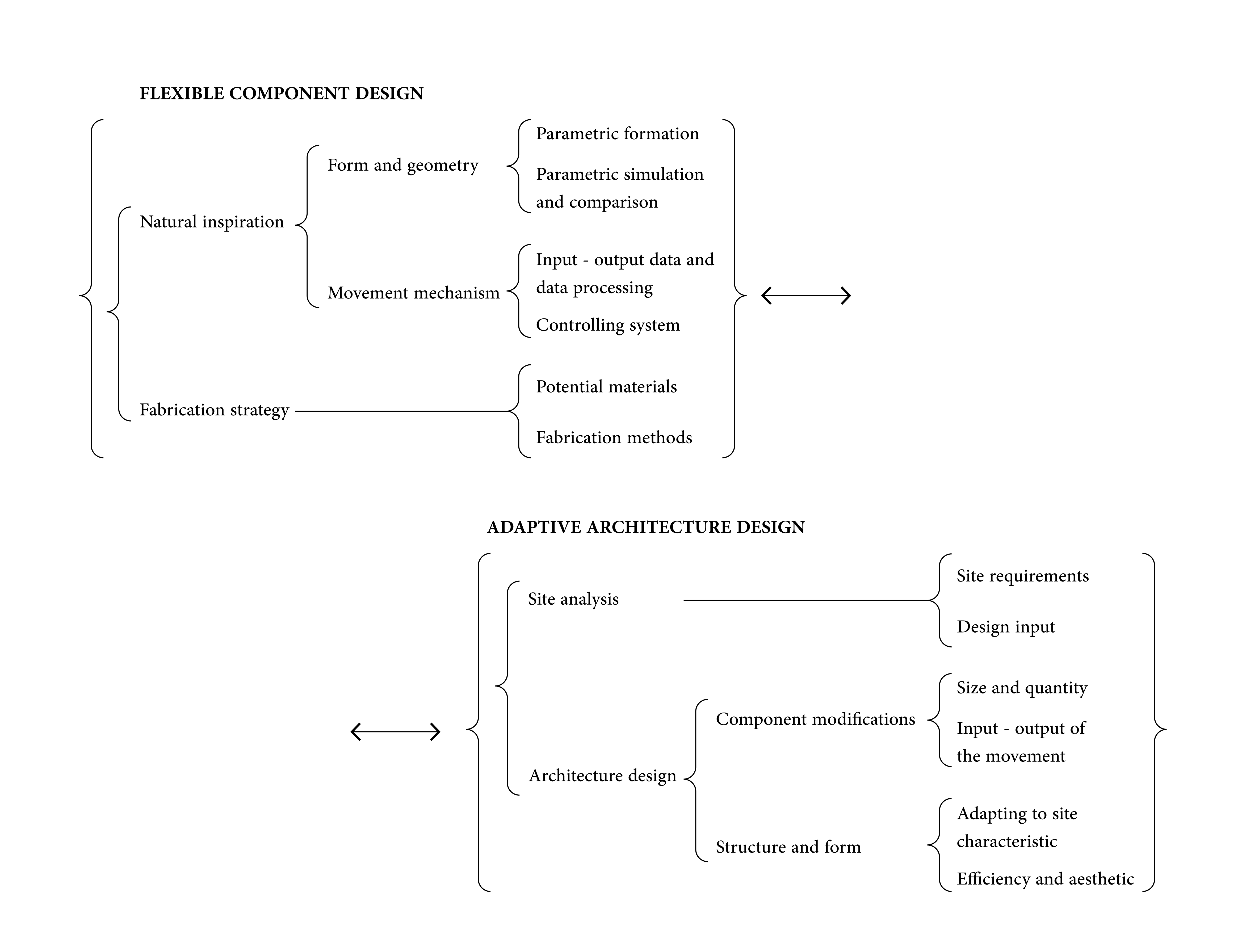 This study proposes a design process that can be suitable to dynamic architecture. Developed from a dynamic component design, the process explores the balance between architectural adaptability and flexibility. While an architectural component needs to be flexible to be applicable to different environmental and functional requirements, the adaption process applied to a specific site transforms it and limits its flexibility.