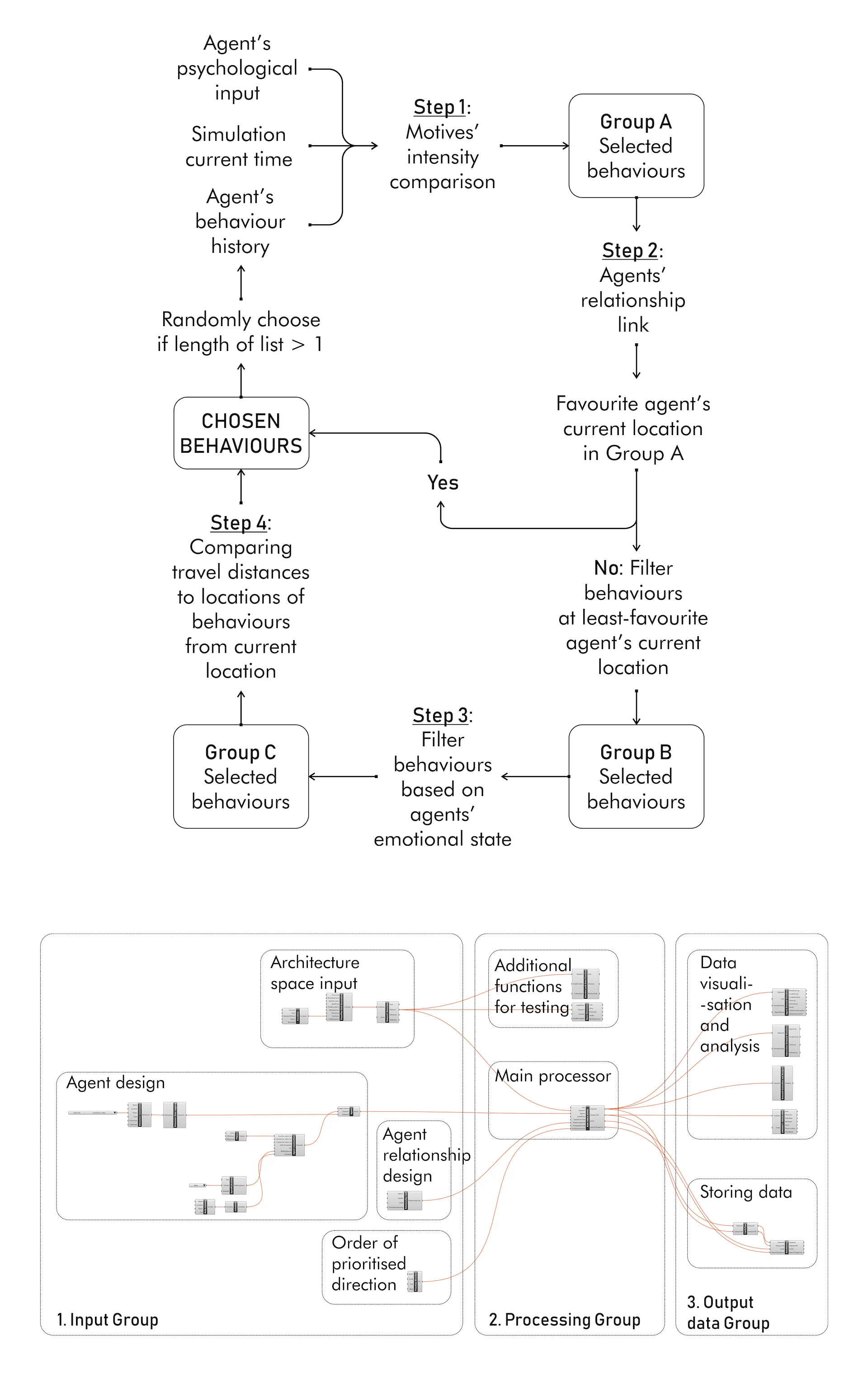 The aims of this study is to investigate how human emotion and behaviour relational to surrounding built environment can be modelled and simulated digitally, by creating a parametric platform that provides simulation of human inhabiting changeable virtual environments involving agent-based modelling. With its innovative idea of connecting cross-disciplinary knowledge, the study is expected to produce novel applications of computational tools and to demonstrate prototypes of ‘virtually lived’ architecture, which will help architects to upgrade their design through users’ spatial engagement.