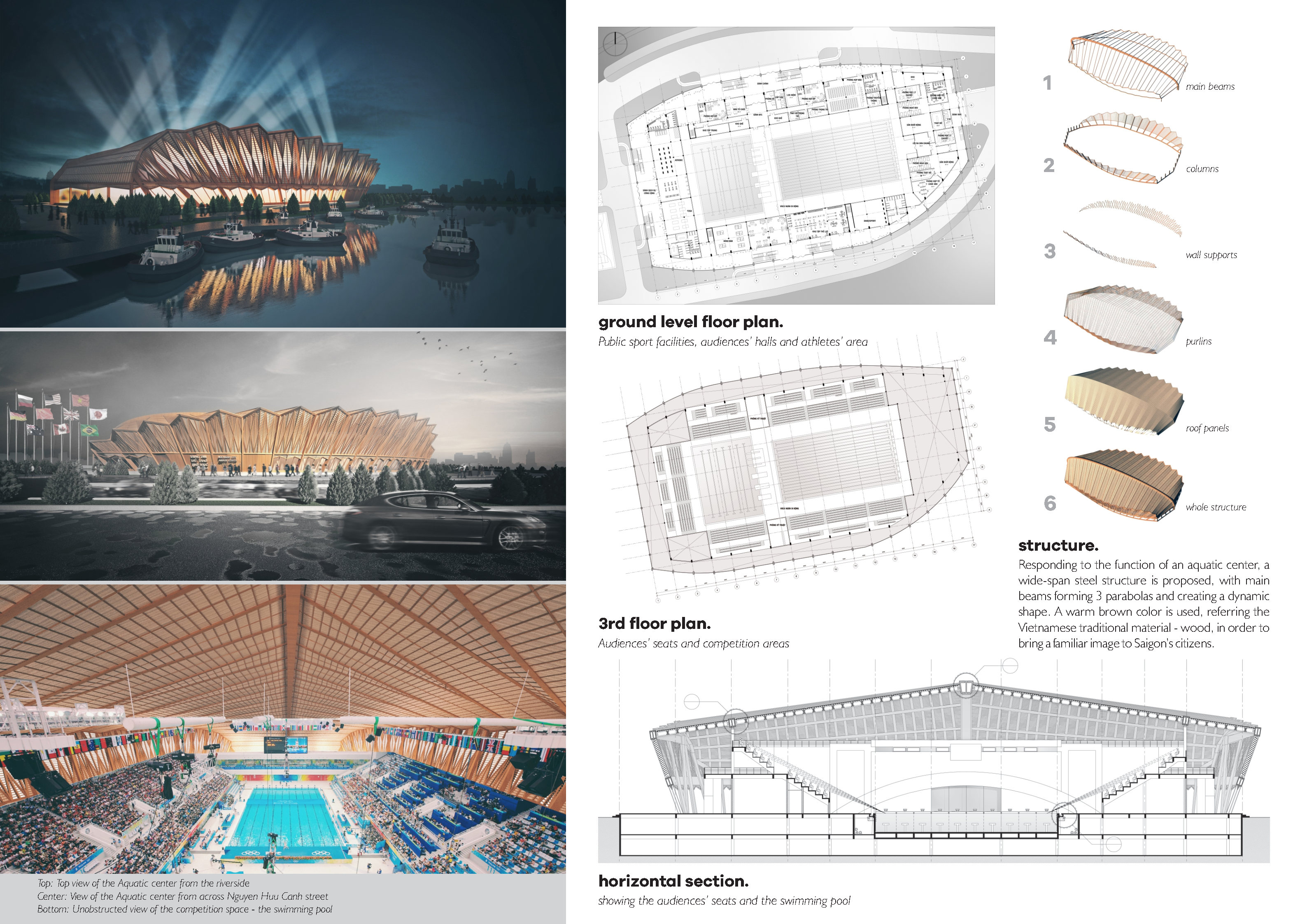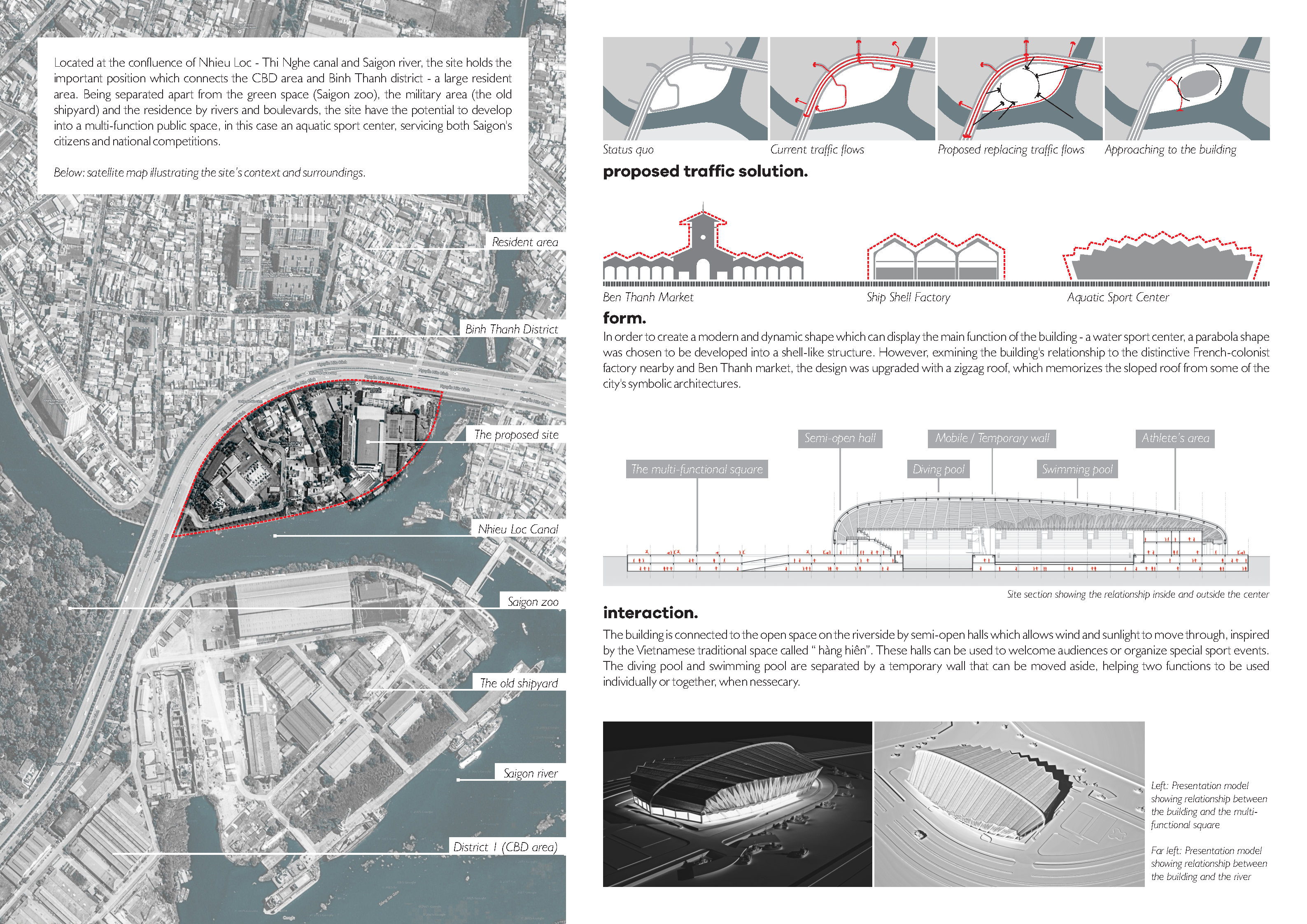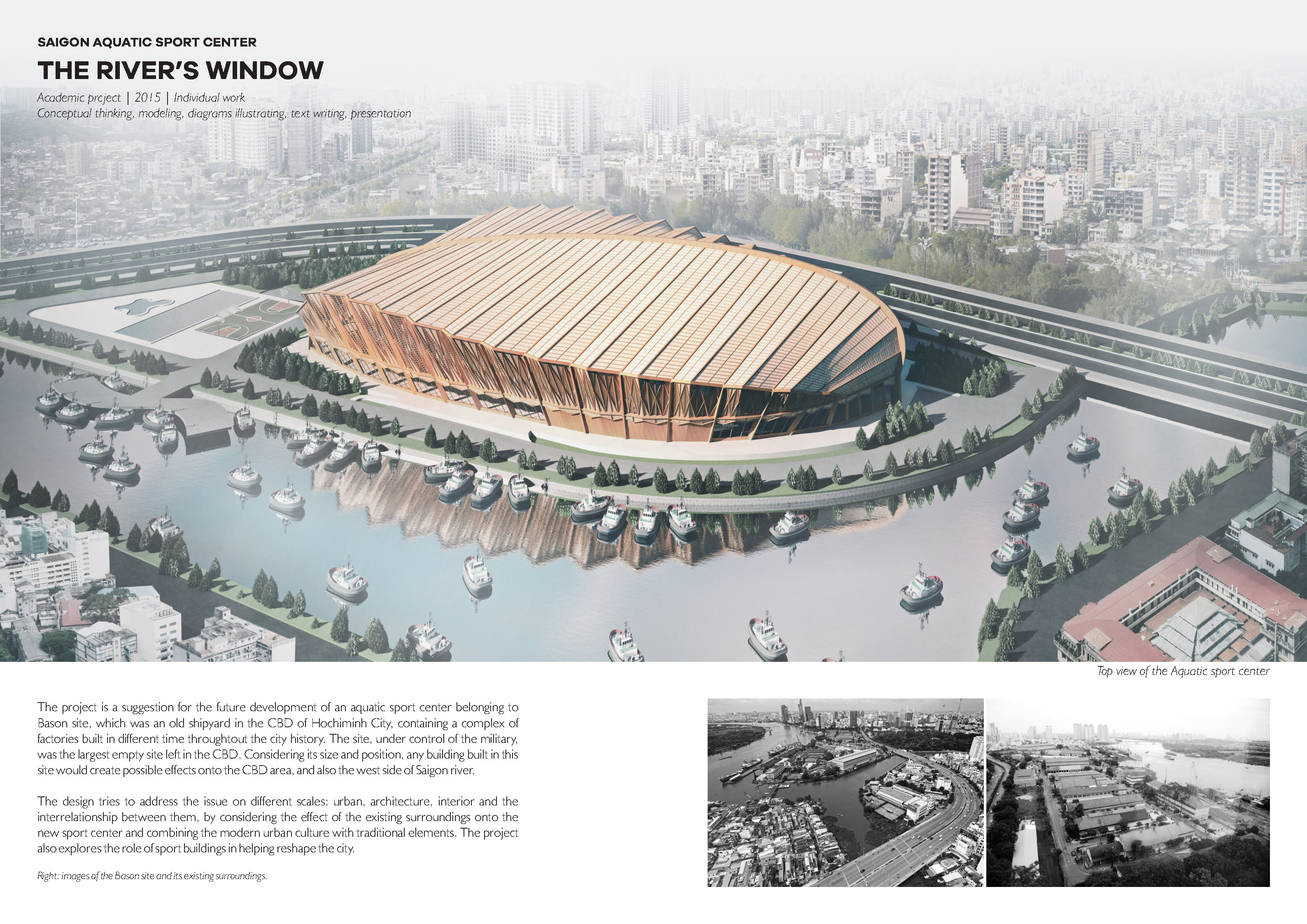 The project is a suggestion for the future development of an aquatic sport center belonging to Ba Son site, which was an old shipyard in the CBD of Ho Chi Minh City, containing a complex of factories built in different time throughout the city history. The site, under control of the military, was the largest empty site left in the CBD. Considering its size and position, any building built in this site would create possible effects onto the CBD area, and also the west side of Saigon river.