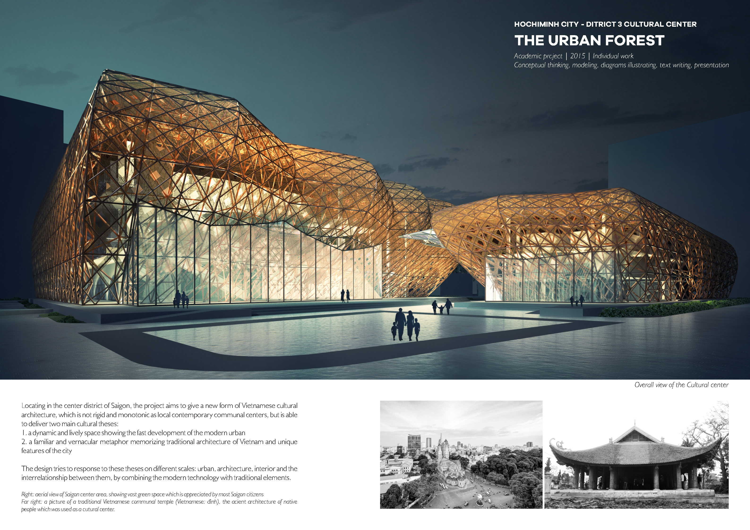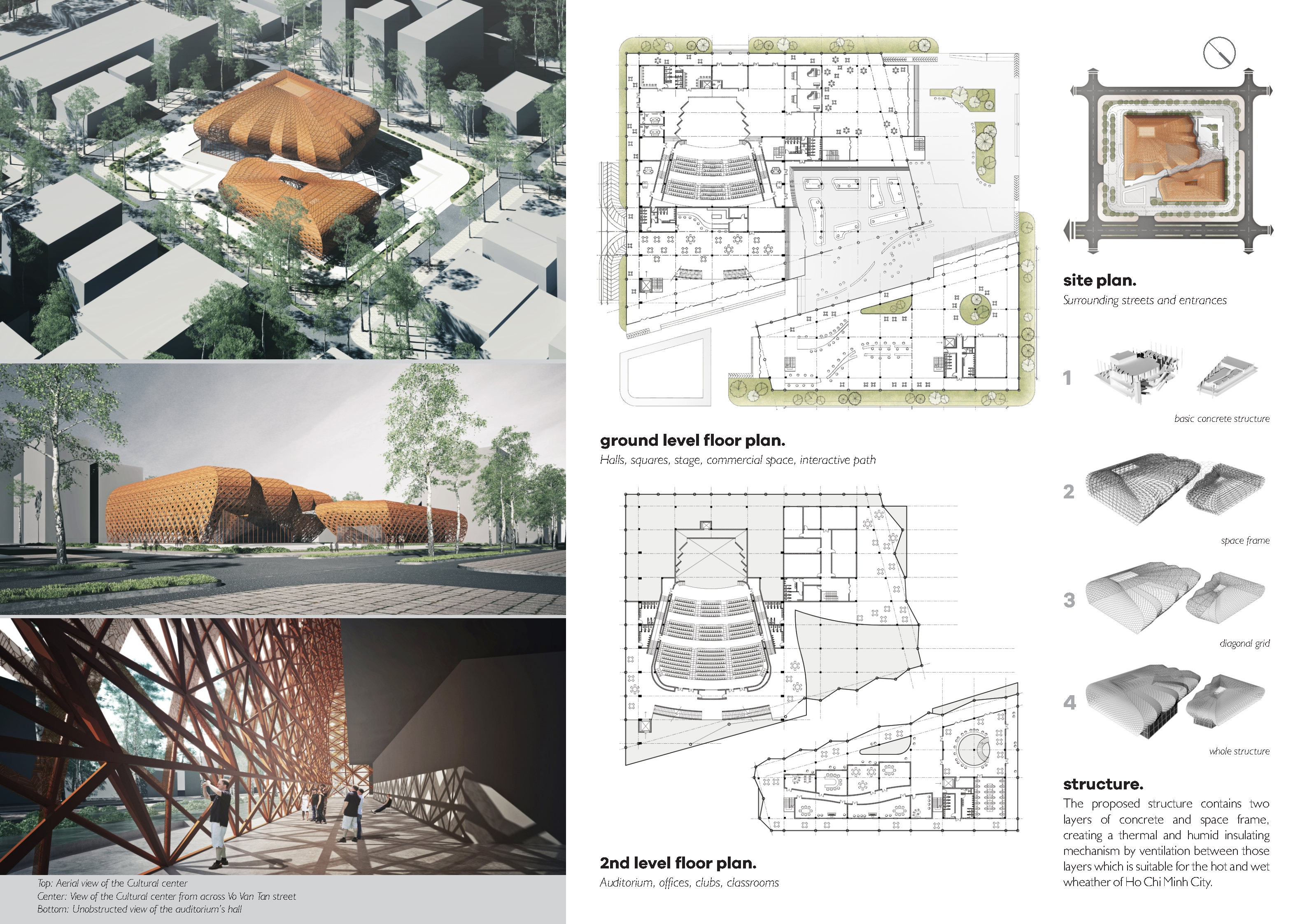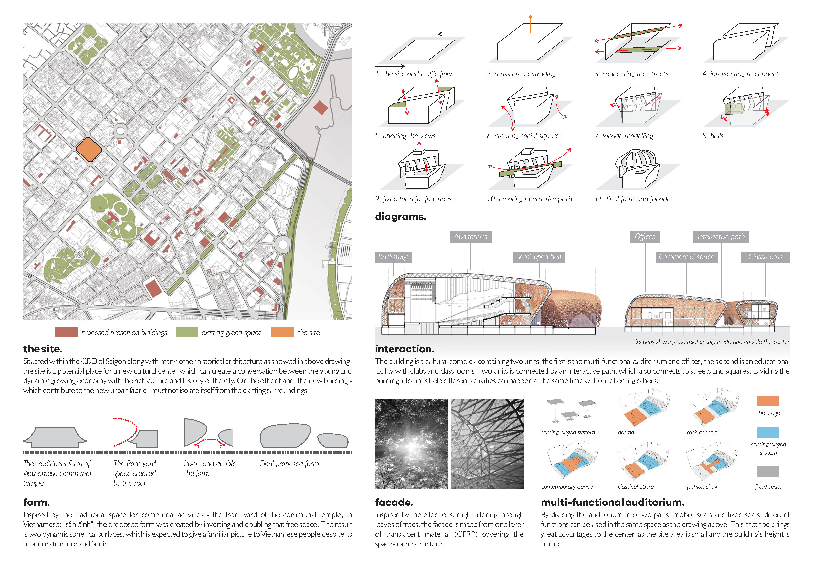 Locating in the center district of Saigon, the project aims to give a new form of Vietnamese cultural architecture, which is not rigid and monotonic as local contemporary communal centers, but is able to deliver two main cultural theses: