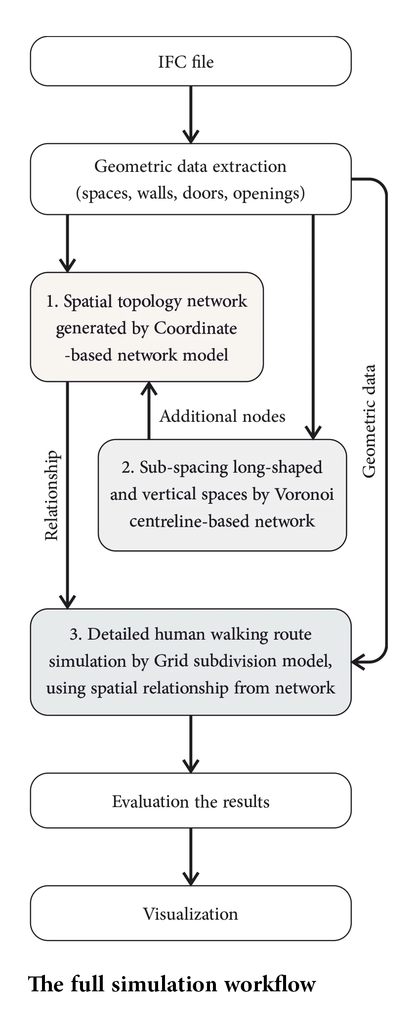 It can be seen that each algorithm is suitable for specific space shape or calculating level. Therefore, to achieve a precise and convenient network simulation, a combination between them is proposed. is new workflow includes three steps corresponding with three algorithms:
