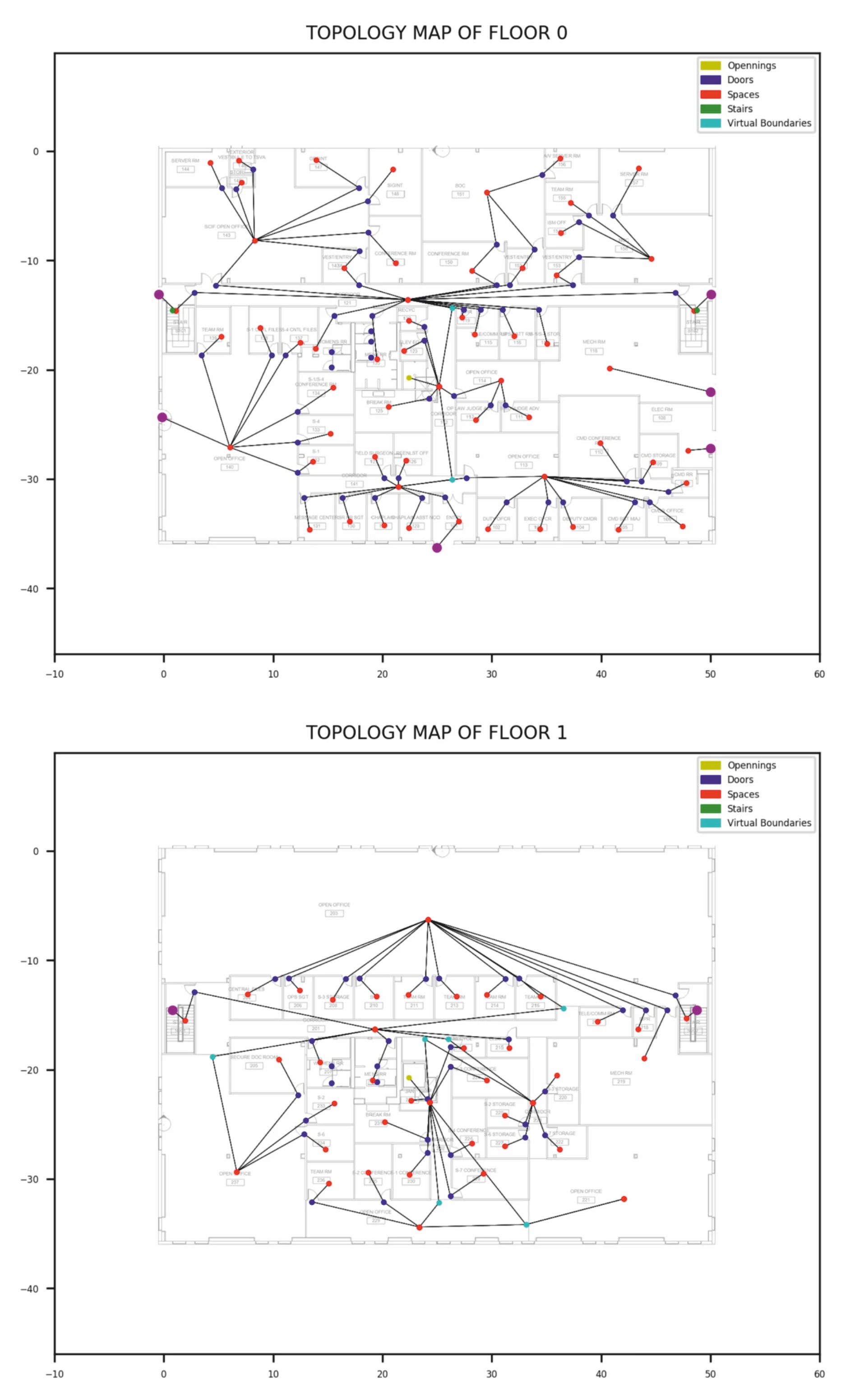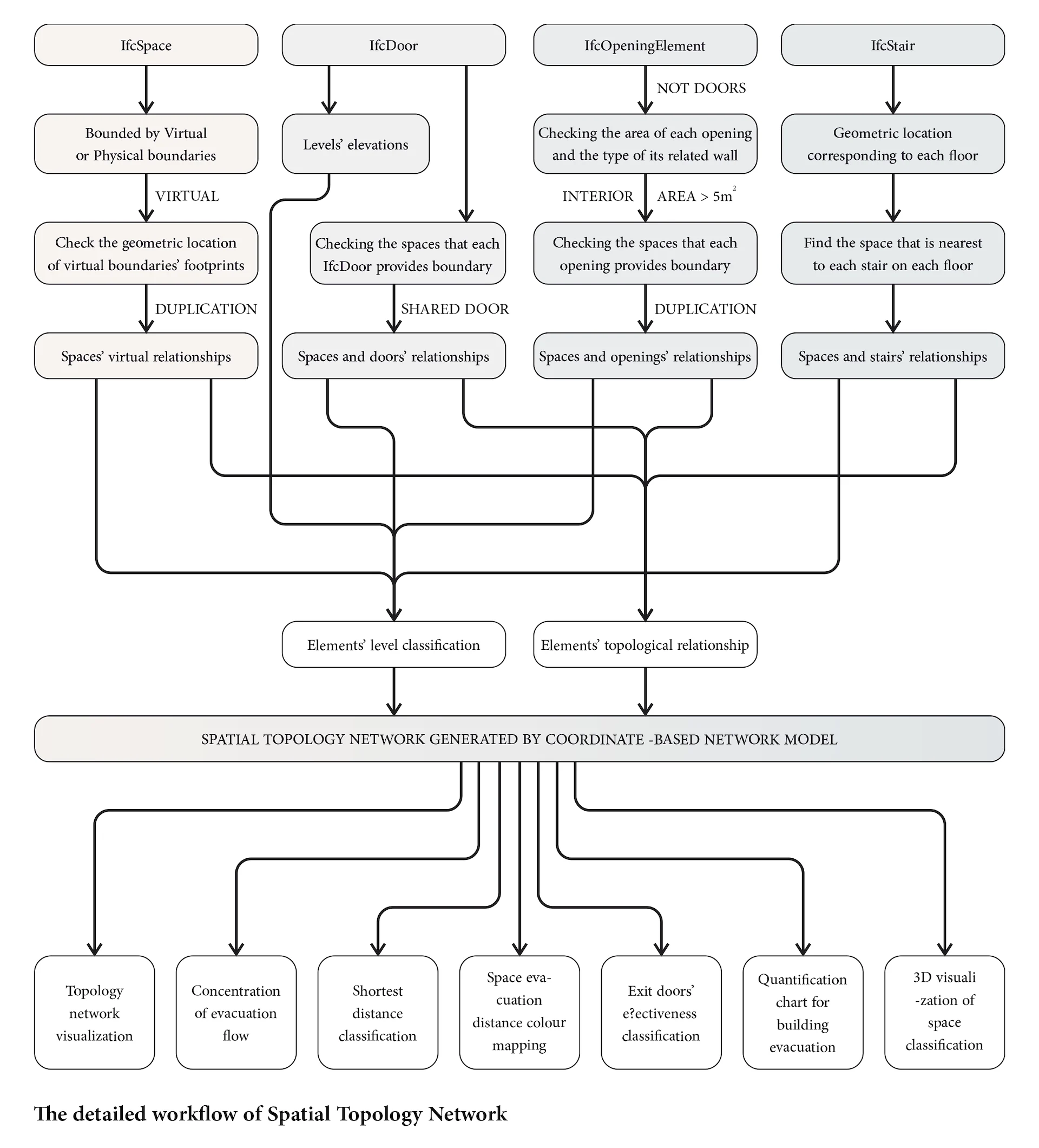 We continue with a detailed coding proposal for step 1. The requirement of this step is to extract correct relationships between spaces, which has not been achieved in any reference paper. Overall, there are three types of connection between spaces that need to be import: (1) Spaces connected through doors; (2) Spaces connected through virtual boundaries and (3) Spaces connected through openings.