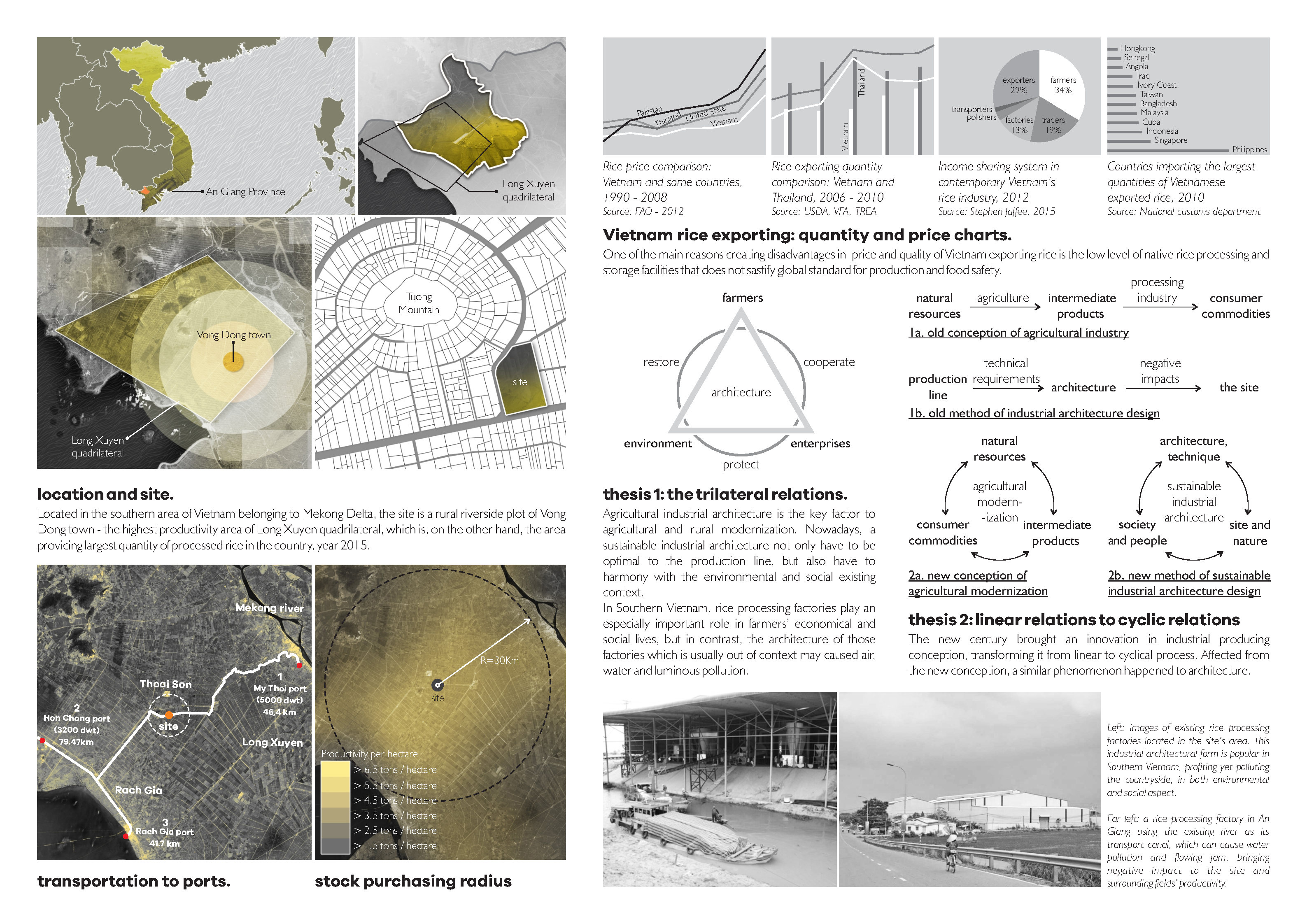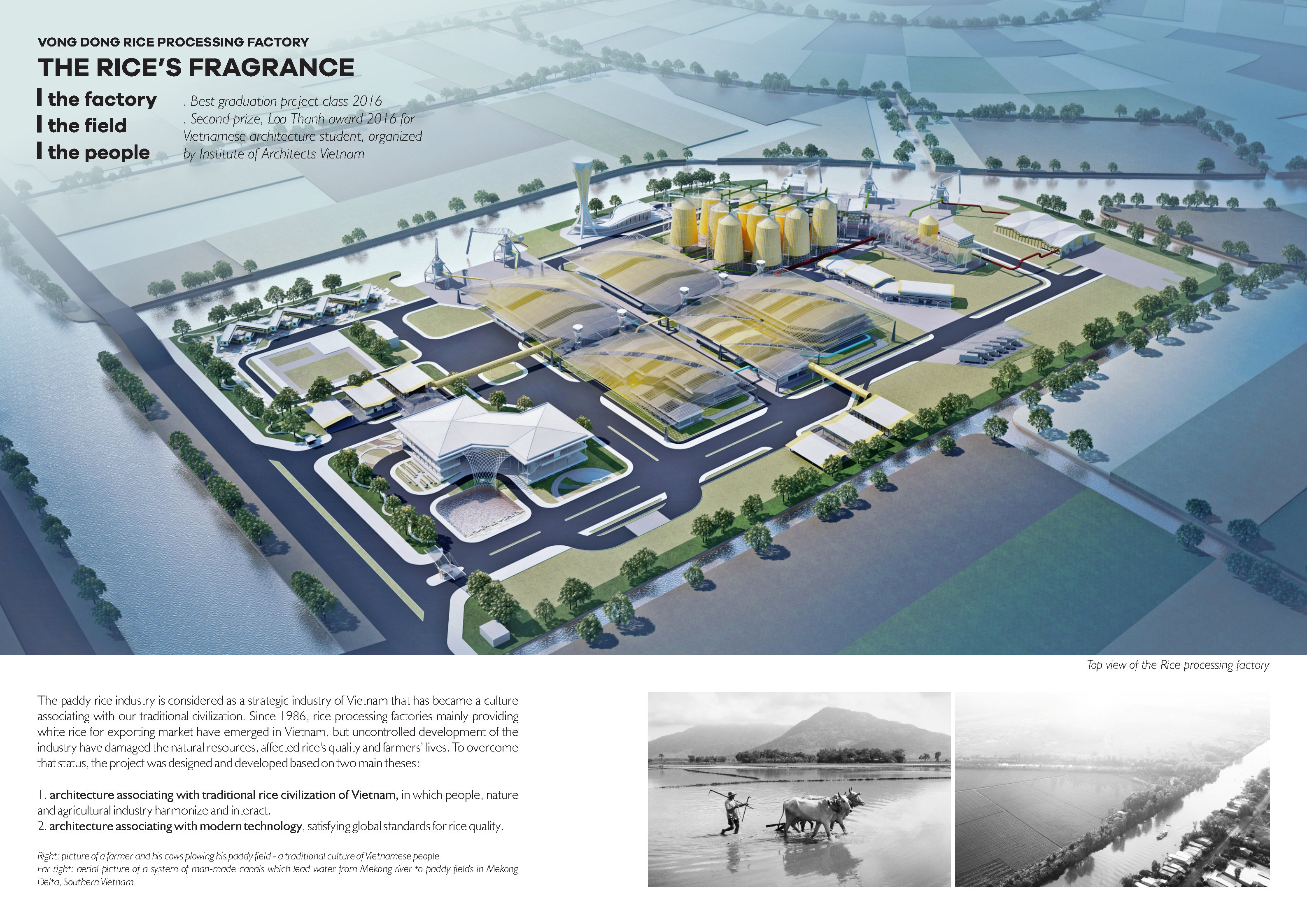 The paddy rice industry is considered as a strategic industry of Vietnam that has became a culture associating with our traditional civilization. Since 1986, rice processing factories mainly providing white rice for exporting market have emerged in Vietnam, but uncontrolled development of the industry have damaged the natural resources, affected rice’s quality and farmers’ lives. To overcome that status, the project was designed and developed based on two main theses:
